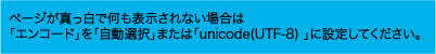 ページが真っ白で何も表示されない場合は、 IEを例にしてご説明しますと、 メニューバーの「表示」→「エンコード」→「自動選択」または「unicode(UTF-8) 」を選択して下さい。