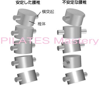 中央の図 左は、分節筋がしっかりと働いている腰椎で、ぐらぐらしません。理想的な状態です。 一方、右は分節筋(インナーマッスル)の働きが鈍く、腰椎がぐらぐらしている状態です。 間接や靭帯、椎間板などを痛めやすく、腰椎の原因となりえます。 →
