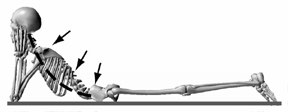 腹臥位から、膝をついて上体を起こさせ、床でテレビを見るような格好(=腰部マッケンジー・エクササイズの格好)をとらせると、正常であれば、脊柱は後頭骨から仙骨までキレイに反り返ったアーチを描くのだが、屈曲姿勢になれた患者では、特に上記の3点で、コブのように移行部が盛り上がっているのを観察出来る。患者の上半身が裸であればも視診でも判るし、脊柱のスタティック・パルペーションをしても、用意に触知できる。さらに、P-A(背腹方向)に軽く押してみると、強いリストリクションを感じ取ることが出きる(図1)。
